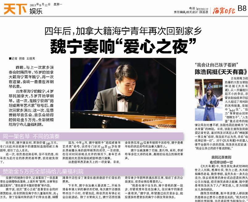 2013年8月11日晚,16岁的魏宁Louis Wei在中国海宁举办了一场“爱心之旅”慈善钢琴音乐会,5岁的王帅文Ryan Wang,6岁的张睿宏Ray Zhang和10岁的魏佳Chrisitina Wei作为特邀演出嘉宾同台进行了演出。近千名观众现场观看了音乐会,本次演出共筹得5万元,全部捐赠给海宁市儿童福利院。