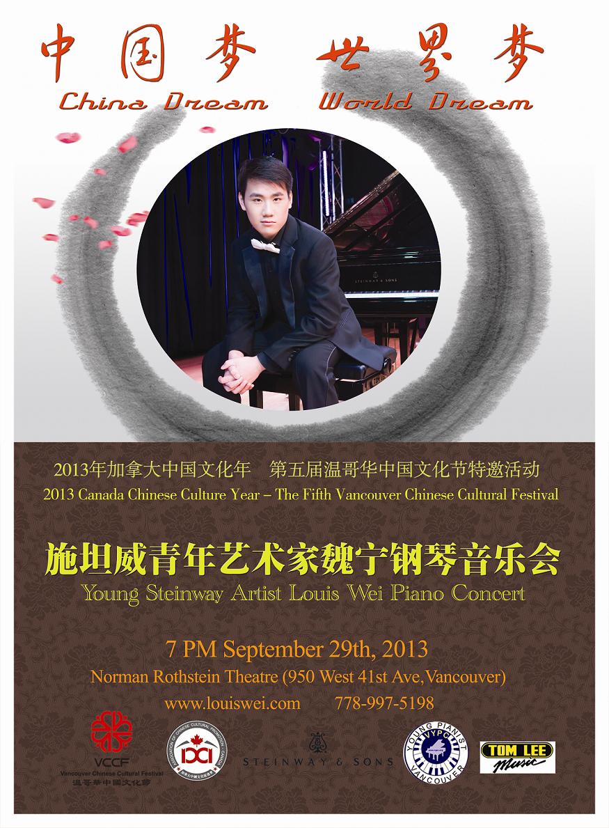 为配合2013年加拿大中国文化年活动以及加拿大全国文化日(Culture Days)活动,中国人民对外友好协会、加拿大中国文化促进会將于9月28日-10月6日联合举办第五届温哥华中国文化节,特别邀请施坦威青年艺术家魏宁 (Louis Wei) 举办一场“中国梦,世界梦”钢琴音乐会,时间:2013年9月29日下午7晚,地点:Norman Rothstein Theatre (950 West 41st Ave,Vancouver)。5岁的王帅文Ryan Wang,6岁的张睿宏Ray Zhang和10岁的魏佳Chrisitina Wei将作为特邀嘉宾同台演出。