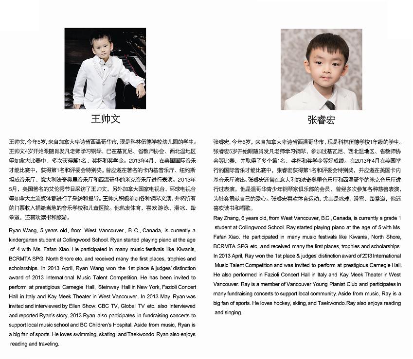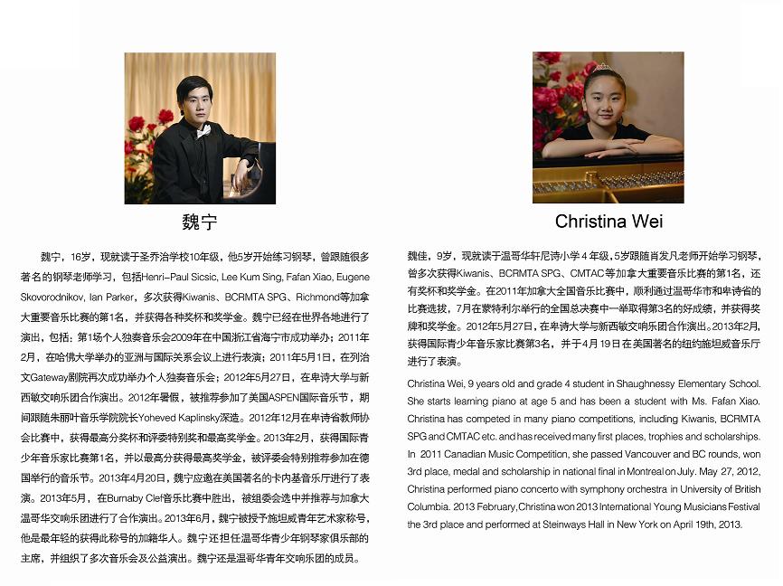 魏宁(Louis Wei),5岁开始学习钢琴,今年14岁,现就读于St George学校8年级, 多次获得过Kiwannis、BCRMTA等比赛第1名,2009年应浙江省海宁市音乐家协会邀请,在中国成功举办个人钢琴音乐会。2011年在哈佛大学亚洲国际会议上进行表演。