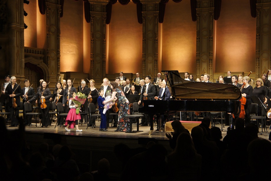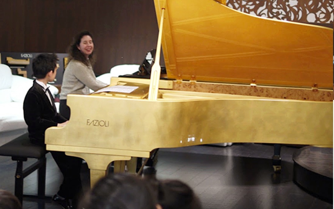 2015年5月8日,世界顶尖钢琴家Angela Hewitt 安吉拉.休伊特给我们的学生Ray Zhang张睿宏上了一堂精彩的大师课,生动的讲评了Ray演奏的莫扎特第17首钢琴协奏曲。这次Angela Hewitt 安吉拉.休伊特应邀来温哥华只有短短4天,要在奥芬剧院Orpheum Theatre与温哥华交响乐团VSO连续演出3场精彩的音乐会。Angela 在百忙之中,抽出时间给我们的学生上大师课,是孩子们的荣幸。即使对那些听大师课的学生和家长,能与世界顶尖钢琴家近距离接触也是一种极大的幸运。5月11日晚,Ray Zhang张睿宏和Xinyi Wang 王馨仪现场欣赏了Angela精彩的音乐会,为这位钢琴家献上了鲜花。