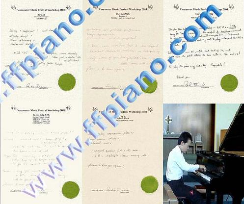 郎朗温哥华大师班 11月5日,著名钢琴家郎朗在温哥华开办大师班(Lang Lang Master Class),选拔优秀的小钢琴家与郎朗同台,接受他的指导。肖老师推荐正在学习演奏级(ARCT)的海韵参加,经过组委会的严格选拔,海韵在几千名候选人中脱颖而出,成为TOP25小钢琴家,参加了这次活动,在现场聆听了郎朗的讲课。 15岁的海韵跟随肖老师学钢琴已经三年,现在学习RCM最高级—演奏级(ARCT)。她学琴刻苦,认真努力,RCM10级钢琴考得90分高分,对应的10级乐理获得100分满分,还多次获得BC、Kiwanis、Vancouver、Richmond等比赛大奖,还一直担任学校合唱队钢琴伴奏和对外演出。现在,海韵不但自己学习钢琴,而且已经成为肖老师的一名助教老师,教授初级的钢琴和乐理,她教授的学生也都取得了优异的成绩。在此,祝海韵在今后的艺术道路上越飞越高,取得更好的成绩。8月在RCM皇家钢琴考级中:Juye自09年2月来到温哥华,跟随肖老师学习仅半年,参加10级乐理考级(Grade 2 rudiments)获得满分100分,参加10级钢琴考试获得82分,现进入演奏级(ARCT)学习。Sharon参加8级乐理(Pre. rudiments)考试,获得满分100分,Qiwei获得95分。其中,助教Haiyun担任Qiwei的乐理老师。 在2009年St. Thomas Music Festival中,4岁的Amenda获得Junior组(1至4级)总分第一名,荣获奖杯和奖学金