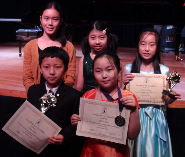 2013 North Shore Music Festival 2013年3月,在North Shore比赛上5岁的Ryan Wang和6岁的Ray Zhang各获得4个奖杯,共8个奖杯,应邀参加了颁奖演出。颁奖音乐会后,Ryan和妈妈Iris Wang,Ray和妈妈Lilian Li与肖老师一起合影留念。 在2013年1月的RCM钢琴考级中,Christina Wei获得8级91分,Mimi Meng获得ARCT级89分,Yang Cao(成人)获得6级84分。 2013 BCRMTA Celeration of Excellence Recital 2013年2月3日,我们的5名学生参加了卑诗教师协会温哥华分会的优秀学生表彰音乐会,她们在2012年度的RCM考级中获得90分以上,其中:Wan Chen(5级95分)和Jessica Chen(8级94分)是本级别最高分,获得奖杯、奖学金和证书,Alicia Hu(4级93分)是本级别次高分,获得奖牌、证书,Mimi Meng(10级90分)和Lin Jie Zhang(8级91分)获得荣誉证书。