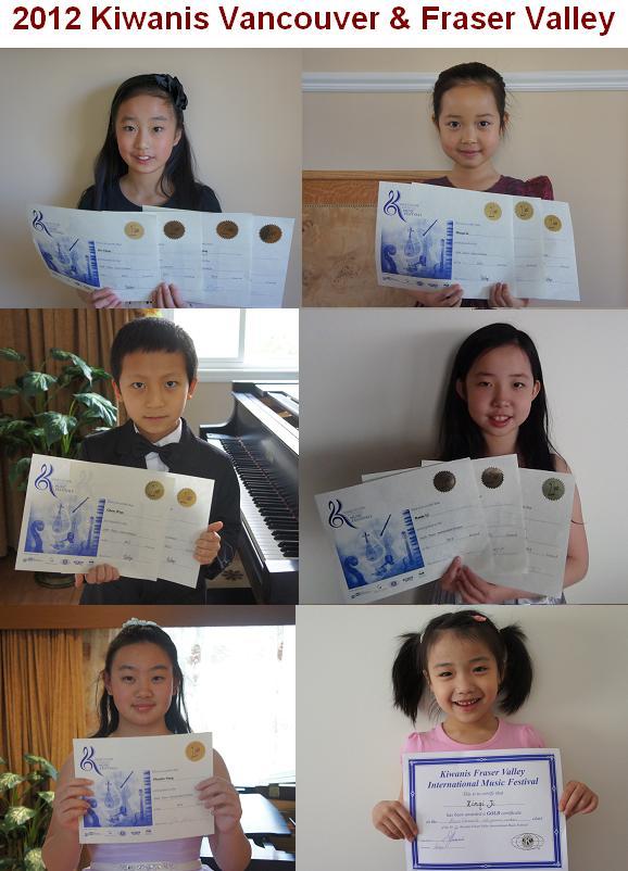 2012 Kiwanis Vancouver & Fraser Valley Internationl Festival 4月,肖老师共派出6名学生,在Kiwanis比赛中都获得了第1名的好成绩,其中:Jie Chen4个第1名, Shuqi Li3个第1名,Rosie Li3个第1名,Chen Wan2个第1名, Phoebe Pang1个第1名。Xinqi Ji在Kiwanis Fraser Valley国际比赛中获得第1名,共获得14个第1名。Jie Chen获得4个奖牌和2个奖学金,Rosie Li获得奖牌,应邀参加了颁奖大会。
