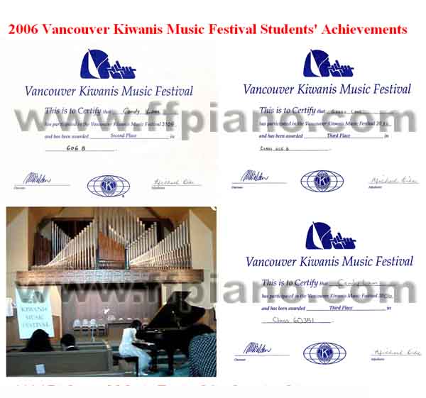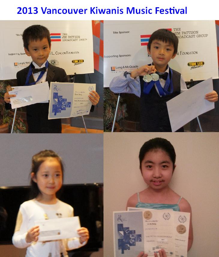 在2013年Burnaby Clef音乐比赛颁奖音乐会上,Phoebe Pang, Chrisitna Wei, Chen Wan, Jie Chen和Xinyi Wang应邀参加了颁奖演出,并获得了奖杯和证书。另外,5岁的Brian Chen在比赛中获得奖牌和第1名。 2013年Kiwanis Fraser Valley Festivals音乐比赛 在2013年的Kiwanis Fraser Valley Festivals音乐比赛中,我们派出的4名学生共获得4个奖牌和1个奖学金,其中:6岁的Jerry Wang获得5级的4个第1名,2个奖牌,5岁的Xinyi Wang获得4个第1名和奖牌,9岁Chen Wan获得7级的3个第1名和奖学金,12岁的Jie Chen获得9级的2个第1名和奖牌,6月15日参加了在Kwantlen Polytechnic University举行的颁奖音乐会。 2013 Vancouver Kiwanis Music Festival 5月,肖老师派出5名学生参加第90届Vancouver Kiwanis Music Festival比赛,共获得6个奖学金,3个奖牌,12个第1名,其中,5岁的Ryan Wang获得2个奖学金和1个奖牌,并作为1级到6级唯一一名被评委推荐的钢琴获奖选手,在颁奖音乐会上进行了表演。6岁的Ray Zhang获得3个奖学金和2个奖牌,Shuqi Li获得1个奖学金。