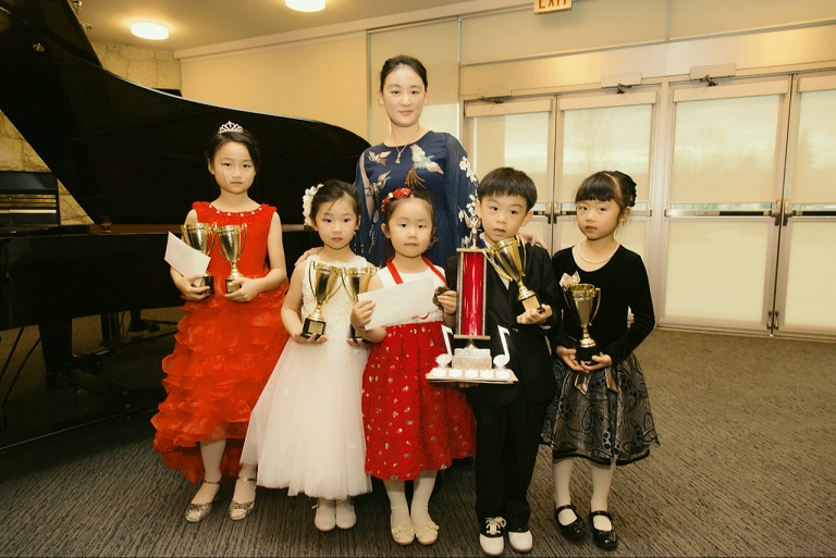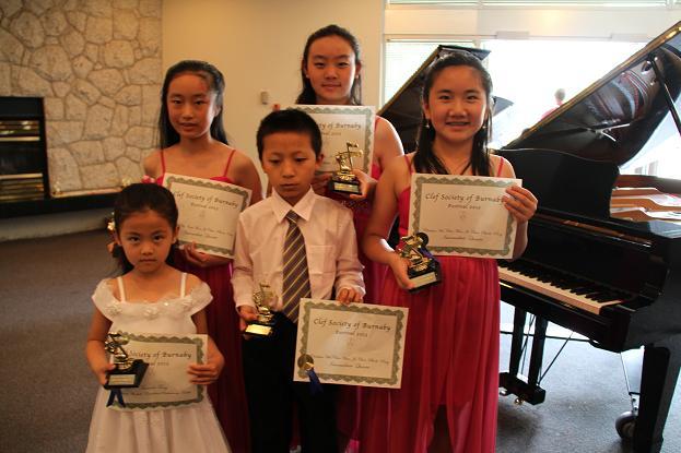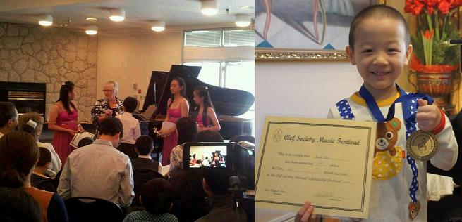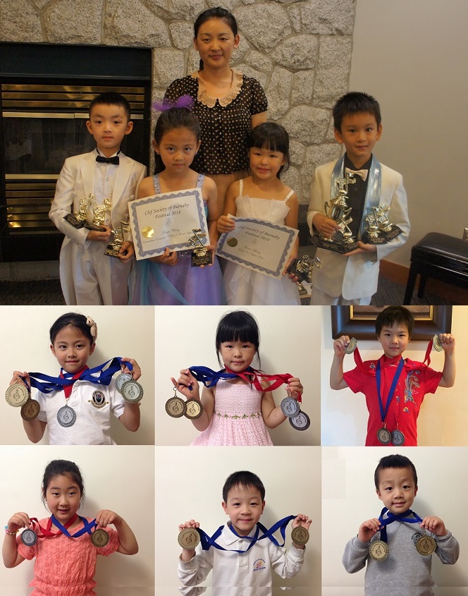 2014年7月,3名学生参加加拿大全国音乐比赛(CMC),以优异的成绩通过市级、省级比赛。在魁北克举行的全国总决赛中,7岁的Ray Zhang以94分获得第2名,6岁的Ryan Wang以93分获得第3名,他们还获得了奖学金。7岁的Jerry Wang取得了91分。 2014 The Clef Society Of Burnaby Music Festival 2014年6月,在Clef Society音乐比赛中,我们的学生共获得4个奖学金,9个奖杯和22枚金奖奖牌,其中:6岁的Ryan Wang获得全部比赛的最高分99.9分,并获得本届比赛的最高奖杯和最高奖学金。7岁的Ray Wang获得7级最高分和奖学金,6岁的Xinyi Wang获得5级奖杯,4岁的Jenna Liang获得1级最高分和奖学金,他们应邀参加了颁奖音乐会并进行了表演。Shizhen Zhang,Justin Lai,Brian Chen和Tim Chen都获得了金奖和银奖奖牌。