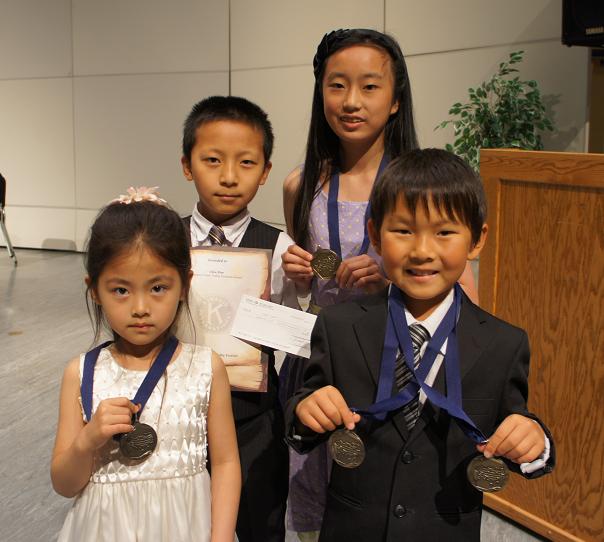 2014 Vancouver Kiwanis Music Festival 2014年5月,肖老师派出3名学生参加第91届Vancouver Kiwanis Music Festival比赛,共获得11个奖学金,5个奖牌,其中:6岁的Ryan Wang获得1到6级组最高奖学金$200,7岁的Jerry Wang获得7到9级组最高奖学金$200。继去年Ryan Wang之后,7岁的Ray Zhang被评委推荐作为1级到6级唯一一名钢琴获奖选手,在颁奖音乐会上进行了表演。