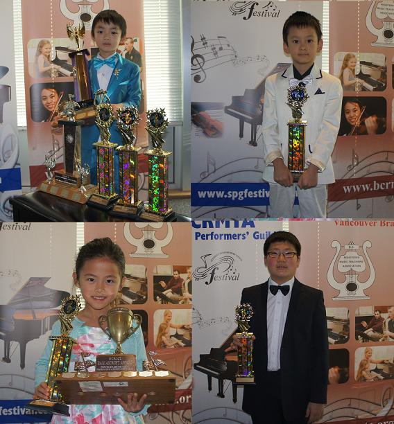 2016 North Shore Music Festival 2016年3月,在刚刚结束的第45届北岸音乐节(North Shore Music Fesitval)的钢琴比赛中,我们共派出4名学生参加,他们全部获得奖杯,共获得13个第1名和6个奖杯,应邀在3月10日举行的颁奖音乐会上,进行了精彩的表演,同时组委会颁发了荣誉奖杯。其中:5岁的Jessica Wang 获得3个第一名和奖杯;6岁的Chengjie Zhou获得4第一名和2个奖杯;9岁的Ray Zhang 获得4个第一名和2个奖杯;10岁的Yini Li 获得 2个第一名和奖杯。最后,孩子们和家长合影留念,更多照片、视频报导,请点击观看我们微信平台专发的文章。 2015年BC教师协会钢琴比赛(BCRMTA SPG Festival) 在12月结束的BC教师协会钢琴比赛(BCRMTA SPG Festival)中,5名学生共获得16个第1名,8个奖杯和5个奖学金,她们应邀参加了12月6日的颁奖音乐会,并进行了表演。其中,6岁的Leon Xiang获得了1到4级最高奖学金300加元和最高奖杯,6岁的Sunny Chen获得了2个奖学金150元和2个奖杯,详细获奖情况请见下面列表。
