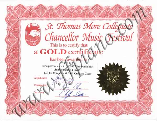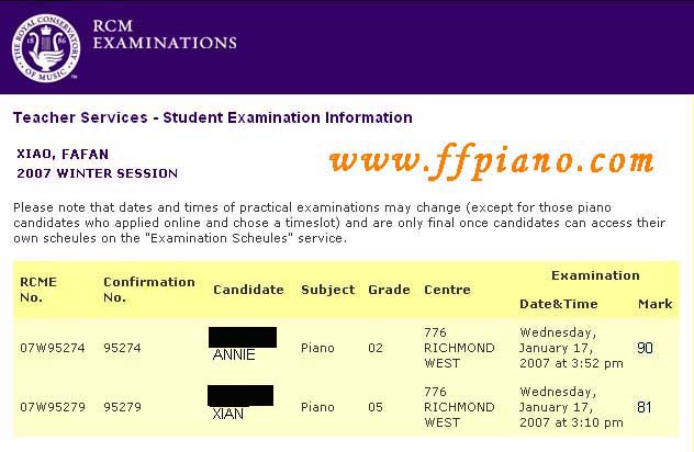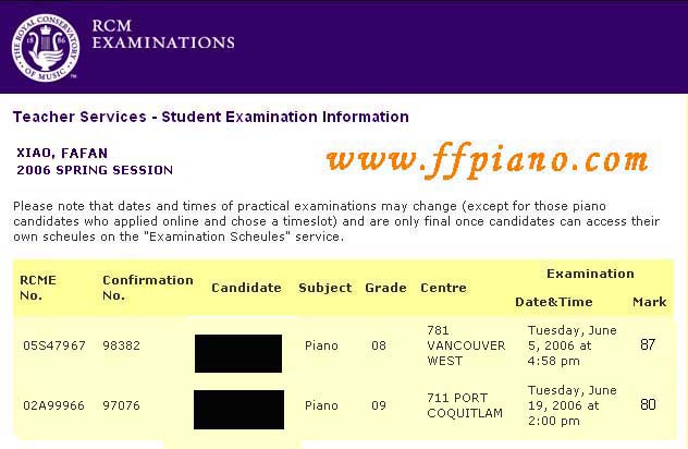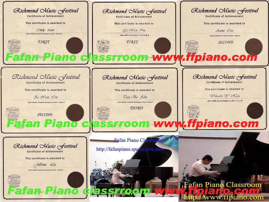 2009年第28届St Thomas Music Festival 5月,在第28届St Thomas Music Festival中,4岁的Amanda获得2級的4个金奖,Haiyun获得演奏級2个金奖,Winnie获得4級2个金奖,Maggie、Melissa和Ruozhou分别获得3級、5級和8級金奖 2009年第86届Kiwanis Music Festival 4月,第86届Kiwanis Music Festival比赛中,Fafan老师的学生Annika Zhou(7岁)获得4级第1名,RUNBAI获得演奏级(ARCT)第2名 在2009年1月的RCM皇家考级中,肖老师6名学生参加考试,均取得了优异的成绩。特别是学琴只半年的Yongkun4級获得91分的好成绩,年仅11岁的Angela完成10級的考级,分数已经达到演奏級的要求,特此祝贺! 2009年1月的RCM皇家考级中,肖老师两名学生参加10級乐理Advanced Rudiments考试,Haiyun得到满分100分,Johnny得到89分,特此祝贺