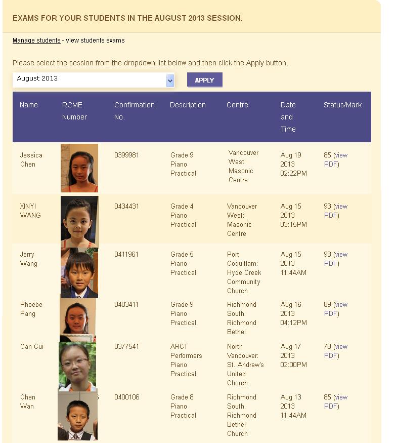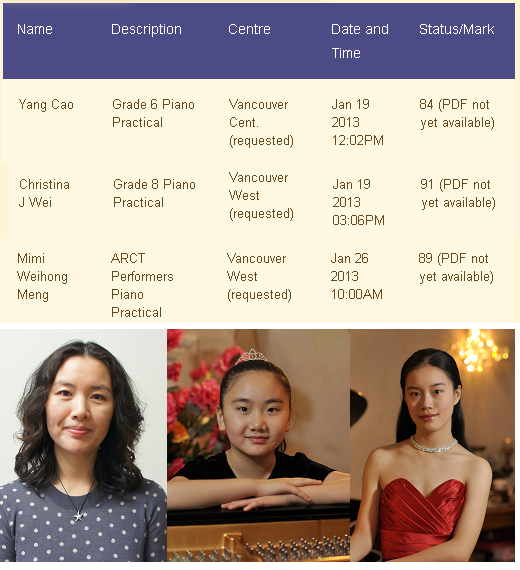 在2013年8月的RCM考级中,6岁的Xinyi Wang获得4级93分,7岁的Jerry Wang获得5级93,Phoebe Pang获得9级89分。 Shuqi Li进入2013年CMC加拿大全国音乐比赛总决赛 在2013年CMC加拿大全国音乐比赛中,7岁的Shuqi Li成功通过市级和省级的比赛选拔,在2013年7月在魁北克举行的全国总决赛中,以93年获得第3名和奖学金。