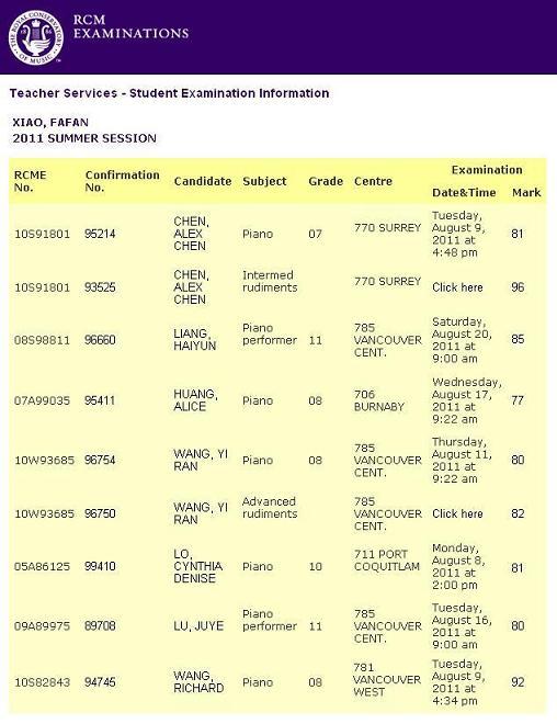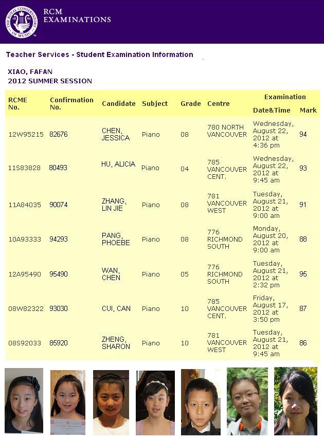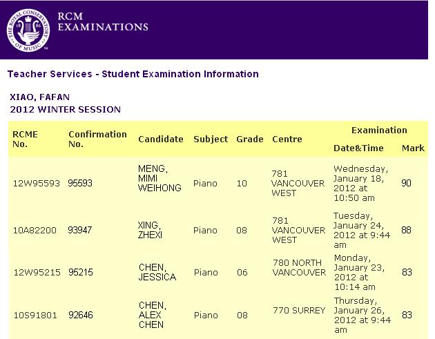 在2011年8月的RCM钢琴考级中,Richard Ranfei Wang获得8级92分,Haiyu Liang和Juye Liu分别获得演奏级(ARCT)85分和80分。 祝贺Christina Wei(7岁)在2011年加拿大全国音乐(CMC)比赛中,顺利通过市级、省级选拔,7月初,在Montreal举行的全国总决赛中获得第3名,91分,并获得奖牌和奖学金。点击进入详细内容