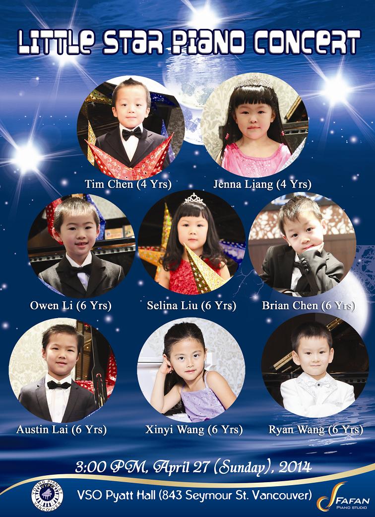 2014年4月27日下午3PM,8名4到6岁的初级学生(Ryan Wang, Xinyi Wang, Selina Liu, Jenna Liang, Austin Lai, Time Chen, Brian Chen, Owen Li)在VSO的Pyatt Hall举办小星星钢琴音乐会,下面是演出照片和VYPC微信平台报道。