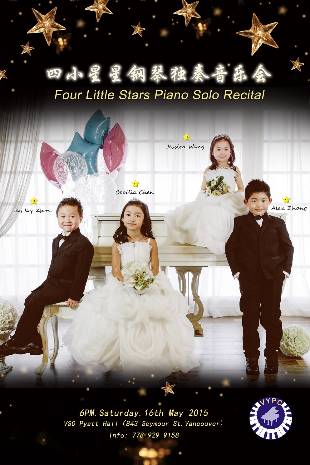 2015年5月16日周六下午6点,在VSO Pyatt Hall (843 Seymour St. Vancovuer),4位5岁的小钢琴家汪琳清Jessica Wang,周澄杰JayJay Zhou,陈艺文Cecilia Chen,张嘉易Alex Zhang举办了一场“四小星星钢琴独奏音乐会”下面是演出照片,视频随后上传。点击查看VYPC微信平台报道。