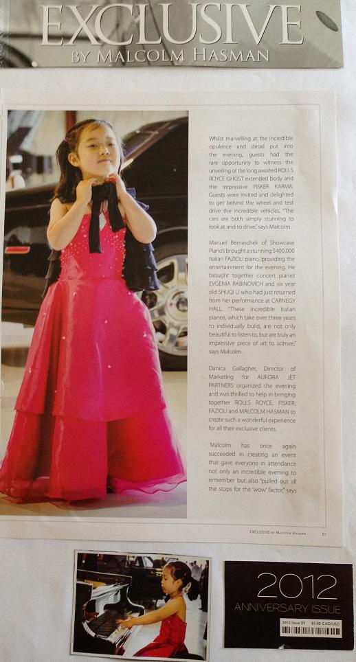 Mulgrave School's Shuqi Li, 6, placed third in her age group at The American Protégé International Piano and Strings Competition 2012 held at the prestigious New York City venue in early March, and has been invited back for a winners' concert finale on Easter Sunday. Li also took home a gold medal at the International Young Musicians Festival, Passion of Music 2012, put on by the American Association for Development of the Gifted and Talented last month.